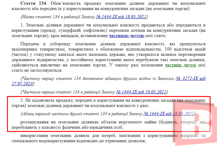 Відповідно до цієї ж статті Закону, дану земельну ділянку не можуть продати (виставити на аукціон), якщо на ній є об’єкт власності іншої особи. Виглядає це наступним чином: громадянка взяла в оренду землю, почала на ньому будівництво, оформила всі документи на нього й таким чином ця земля тепер не підлягає продажу.