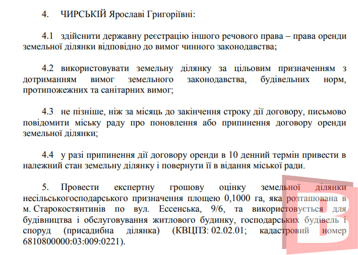 У листопаді 2022-го Старокостянтинівська міська рада надала в оренду Ярославі Чирській одну з земельних ділянок комунальної власності міста. Громадянка отримала право користування даним об’єктом на 15 років.