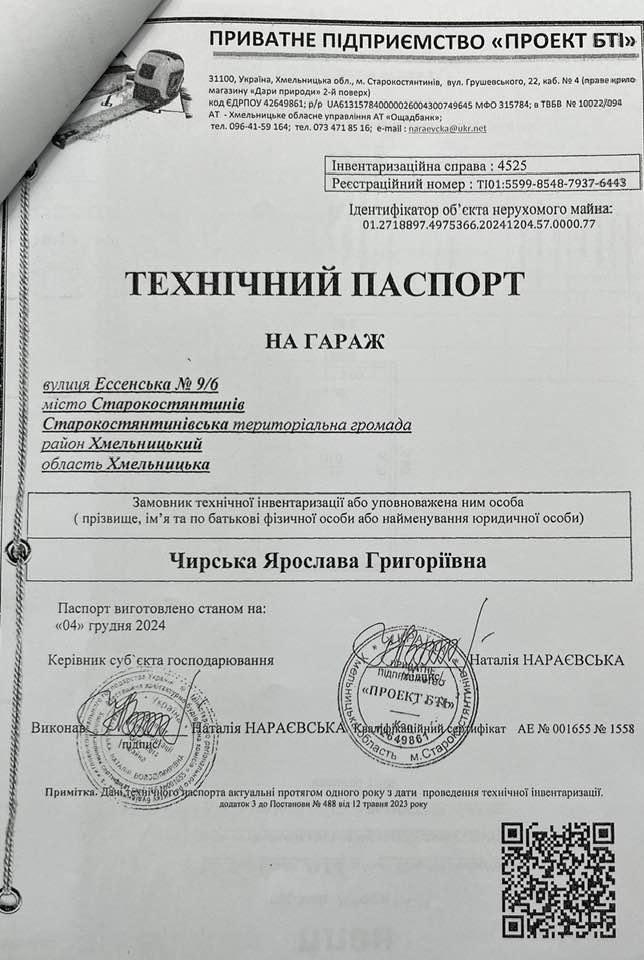 Як зазначає Сергій Фесун, наразі на цій земельній ділянці встановлені гаражі. На них є технічні паспорти, які показав у своєму дописі обранець. Проаналізувавши детальніше документацію бачимо, що мова йде про конкретний гараж, який згідно із техніко-економічними показниками, має площу 20,8 м2. Будівництво розпочалося у 2023-му, а завершилося за рік.