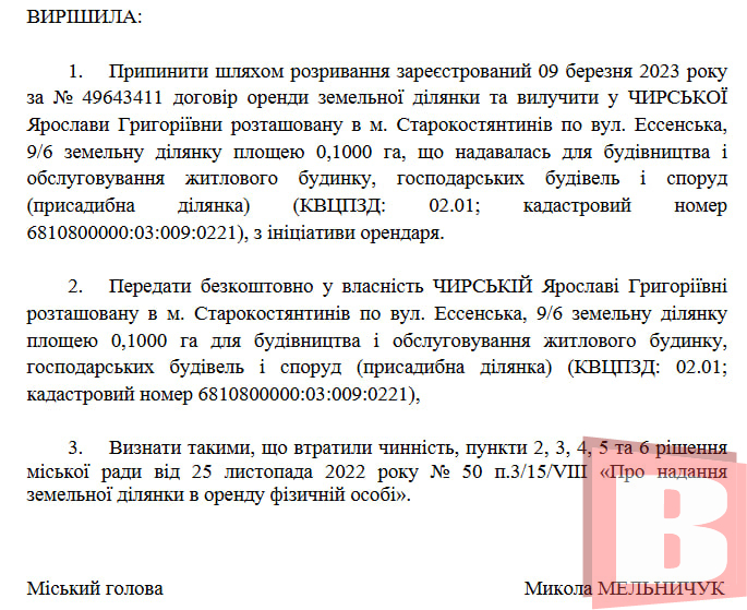 У 2023-му Старокостянтинівська міська рада прийняла нове рішення. На прохання Ярослави Чирської, яку представляла інша особа за нотаріальним дорученням, договір оренди був розірваний. Натомість рада вирішила передати дану земельну ділянку безкоштовно у власність громадянки.