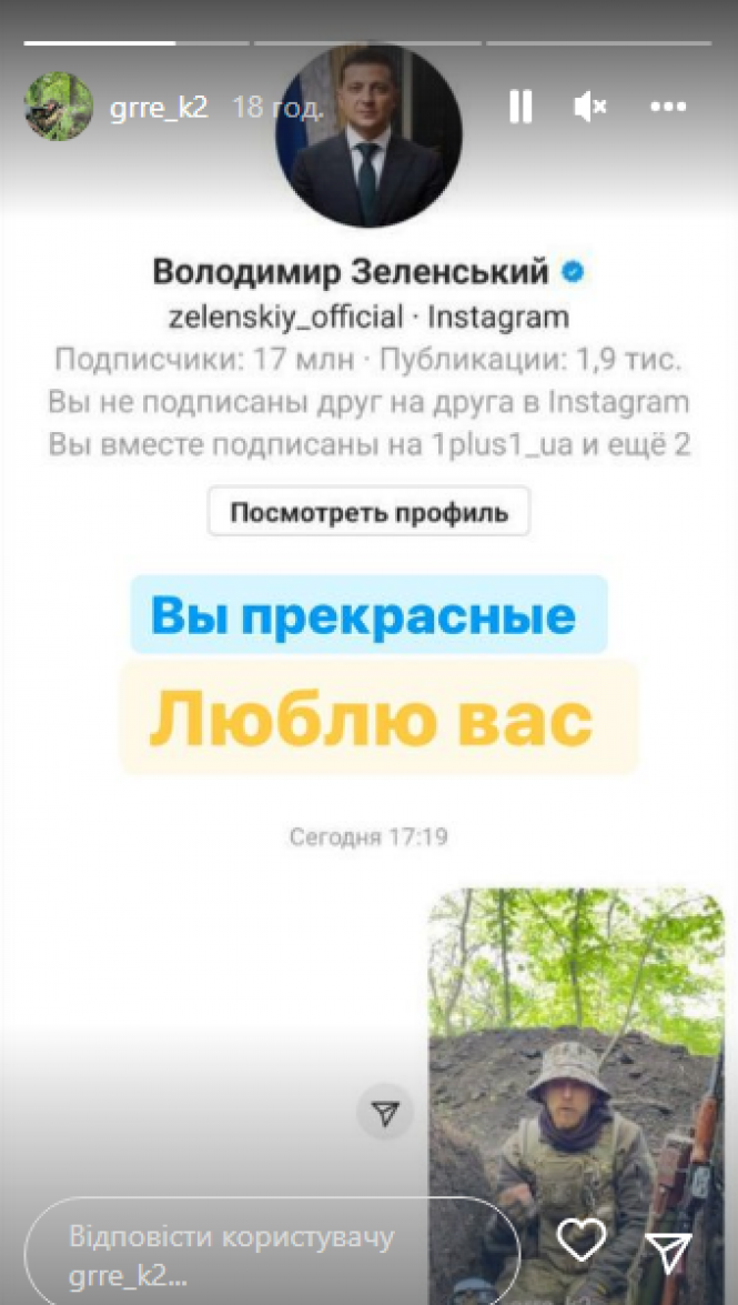Сам доброволець пізніше опублікував скрін, на якому видно, що президент Зеленський відреагував на історію бійця.