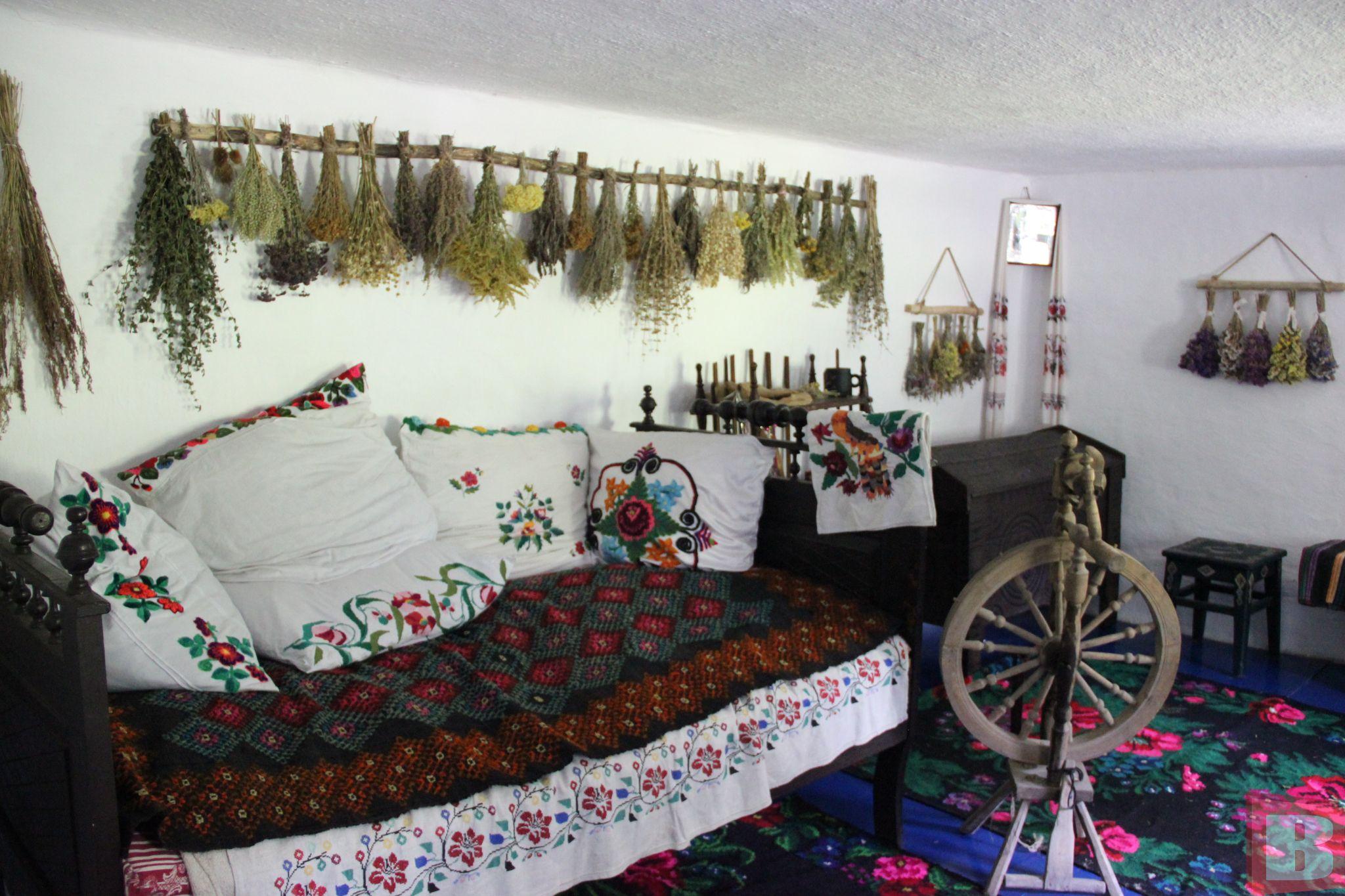 У хатині є декілька кімнат. У самій вітальні можна побачити гончарне коло, ліжко, рушники, килими, дзеркало і різні експозиції із травами. Тут є пара скринь, кожна з яких особлива. Один з таких виробів з доволі автентичним візерунком призначався для зберігання приданого для дівчини в родині.