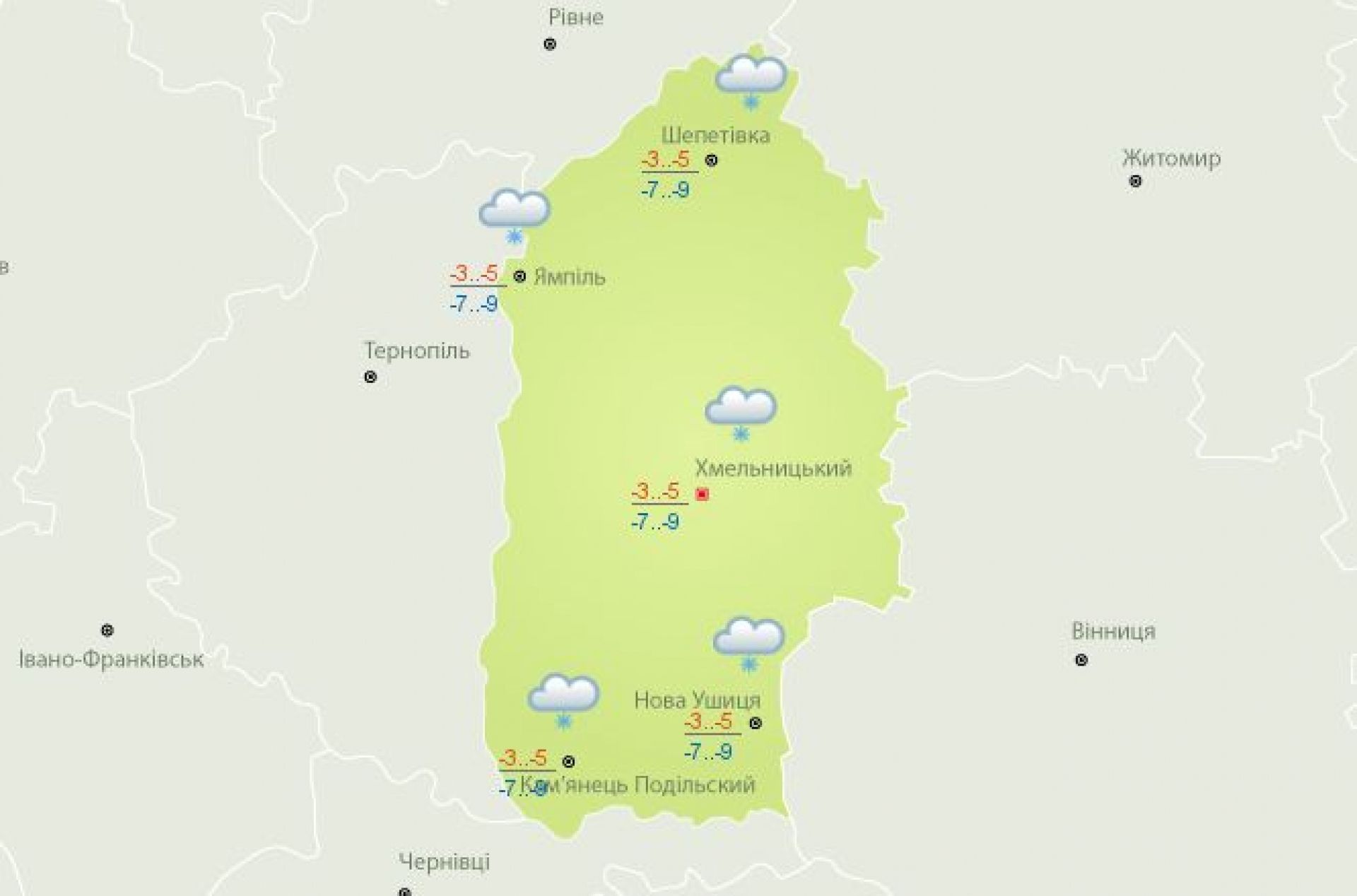 За інформацією Укргідрометцентру, 28 грудня на Хмельниччині очікується до 3-5 градусів морозу вдень. Вночі стовпчик термометра опуститься до 7-9 з позначкою “мінус”.