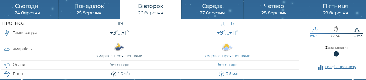 У вівторок, 26 березня – від +1 до +11 градусів. Опадів не буде. Слід чекати на хмарну погоду, з проясненнями.