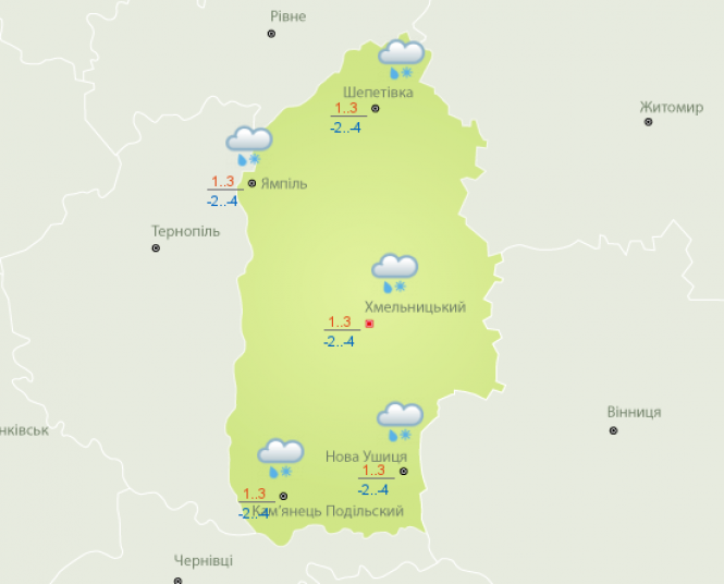 Вихідні обіцяють бути дещо теплішими. Вдень синоптики прогнозують по Хмельницькій області до 4-6 градусів вдень, відсутність опадів і сонце. Та все ж вночі ще стовпчик температура повітря опуститься до 4-5 градусів морозу.
