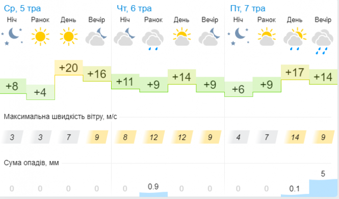 Оскільки атмосферний фронт, який прийде у четвер, буде холодним, в його тилу повітря очікується свіжішим - на Заході, Півночі, в більшості центральних областей +12+17 градусів.