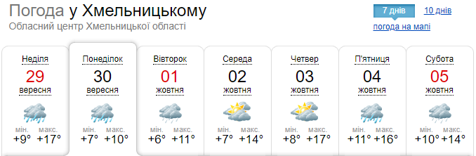 За інформацією Хмельницького обласного центру з гідрометеорології, 30 вересня на Хмельниччині прогнозують дощі. Вітер північний 7-12 м/с, пориви 15-20 м/с. Температура по області вночі 5-10°, вдень 8-13°. У Хмельницькому вночі 6-8°, вдень 8-10°.