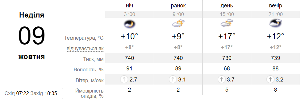 У п’ятницю, 7 жовтня, похмурий ранок зміниться ясним днем та безхмарним вечором. Без опадів. Температура повітря: +11+12 вночі та +13+18 вдень. Вітер південно-західний, 3-5 метрів за секунду.