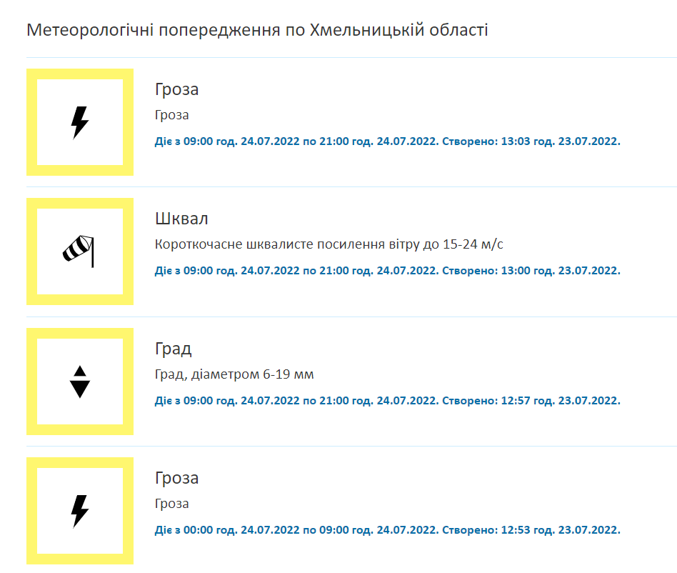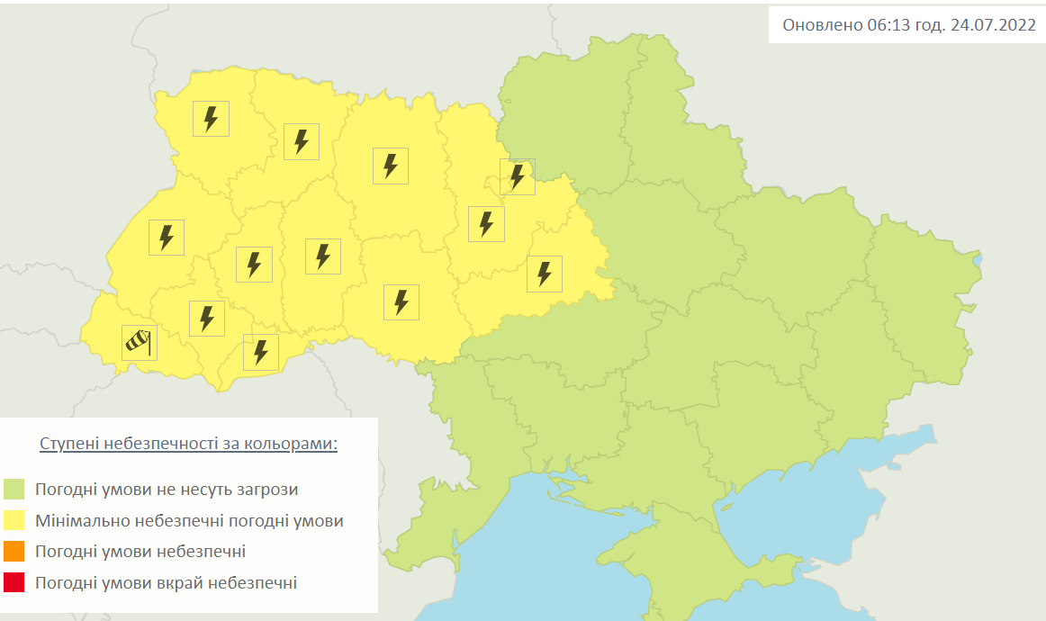 — 24 липня вдень у західних, Житомирській, Київській і Вінницькій областях грози, в окремих районах град та шквали 15-20 метрів за секунду, — йдеться на сайті.