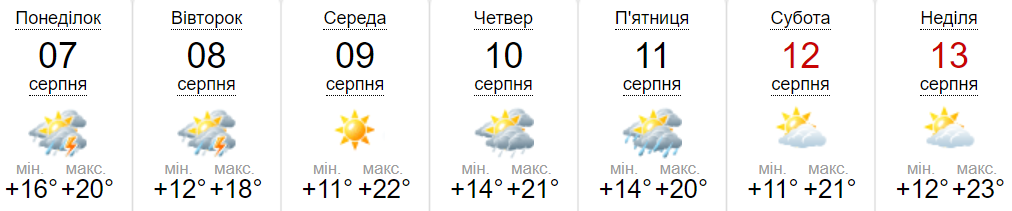 В понеділок, 7 серпня, температура повітря коливатиметься від +16 вночі до +20 вдень. Протягом усього дня небо буде вкрите хмарами. Нічний дощ із грозою до ранку зміниться на сильний дощ. Удень на деякий час він припиниться, а ввечері розпочнеться знову, проте з меншою силою.