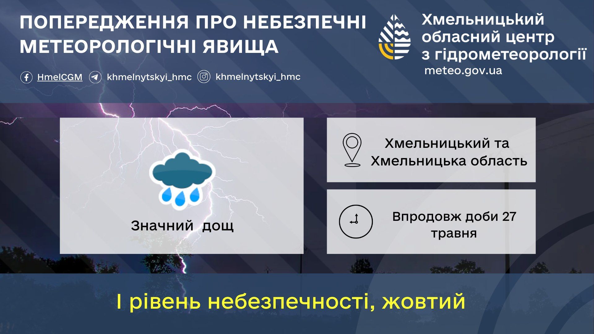Синоптики попереджають про небезпечні метеорологічні явища на Хмельниччині завтра, 27 травня. Оголошено штормове попередження на всю добу. Як повідомляє Хмельницький обласний центр з гідрометеорології, 27 травня область та місто Хмельницький накриє значний дощ. Синоптики оголосили І рівень небезпечності — жовтий.