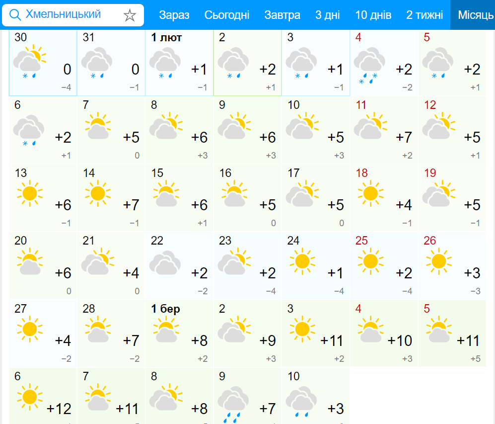За даними Gismeteo лютий буде переважно теплим. Але з невеликими похибками в бік мінуса чи плюса. Із 18 лютого й до кінця місяця можливі невеликі морози в нічний час доби.