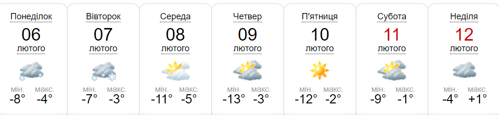 В середу, 8 лютого, ранкові хмари протримаються недовго — вдень та ввечері очікується ясна погода. Без опадів. Температура повітря прогріється до -11 вночі до -5 вдень.
