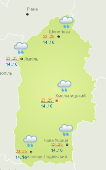 У Хмельницькому передбачають температуру повітря до +23+25 вдень та +14+16 вночі. Дощі та грози. По області погода буде такою: