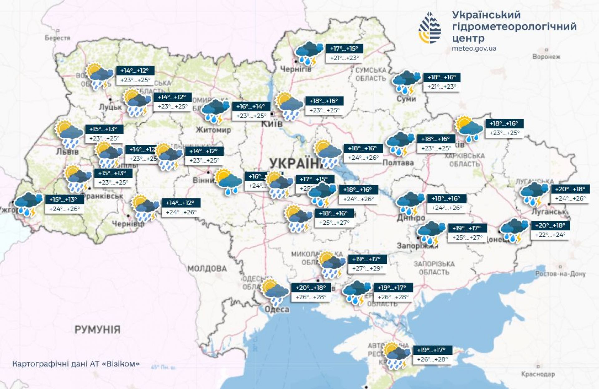 - Прогнозують сильний вітер та грози.