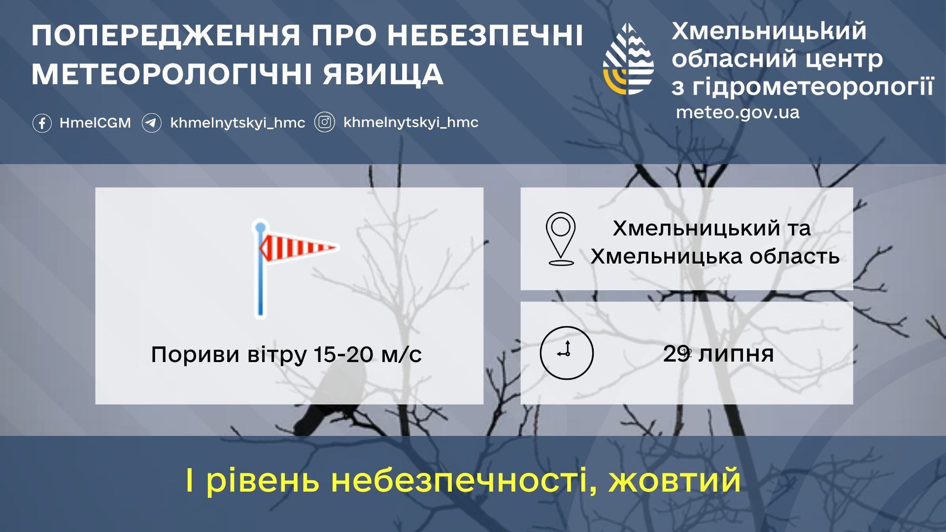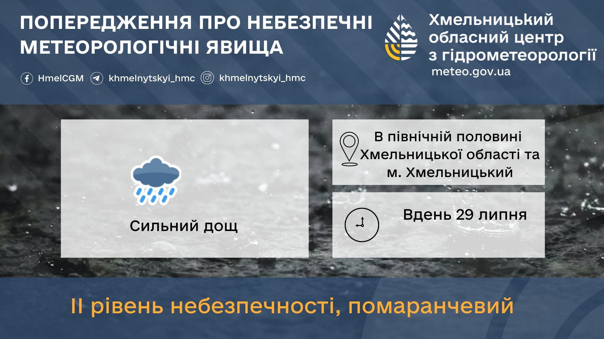 Завтра також варто чекати дощу і вночі, і вдень. За словами метеорологів, вночі 29 липня пройде значний дощ, вдень — сильний. Також очікуються пориви вітру (шквали) до 15–20 метрів за секунду. Вдень місцями ймовірний град. Фахівці попереджають, що негода найбільше може накрити Північ Хмельниччини та обласний центр — місто Хмельницький. Оголошено ІІ рівень небезпечності (помаранчевий).