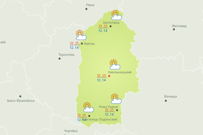 Завтра, 23 липня, на Хмельниччині очікується незначне підвищення температури. Вдень повітря прогріється до 25 градусів, а вночі стовпчик термометра опуститься до позначок 12-14. За інформацією Укргідрометцентру, опадів на Хмельниччині не передбачається.