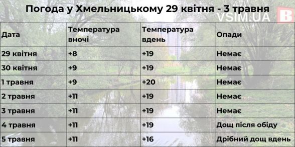 Після тривалого дощового періоду до Хмельницького повертається тепло та сонячна погода. Практично весь наступний тиждень в місті опадів не очікується. Виключення — святкові вихідні. Також на Великдень очікується незначне похолодання.