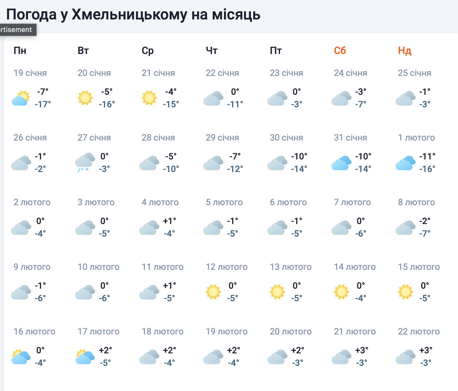 Прогнози погодних сайтів також підтверджують загальну тенденцію до потепління. За їхніми даними, з 22 по 27 січня температура на Хмельниччині буде м’якшою: удень повітря прогріватиметься майже до 0°, а вночі стовпчики термометрів опускатимуться лише до 2–3° морозу.