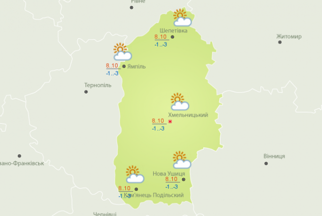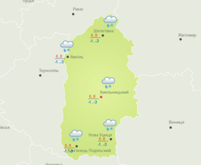 В неділю, 25 квітня, українців попереджають про дощі, є ймовірність снігу. За інформацією синоптиків, на Хмельниччині очікується до 6-8 градусів вдень. Вночі обіцяють до 1-3 градусів нижче нуля. Також можливий дощ зі снігом та рвучкий вітер.