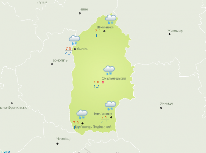 Як інформує Укргідрометцентр, на території Хмельницької області можливі опади. За прогнозами, дощитиме, подекуди ще може пролітати сніг.