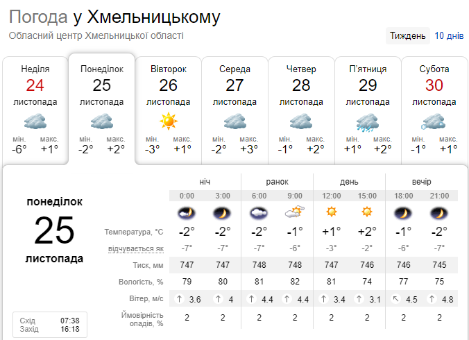 - Понеділок, 25 листопада: денна температура буде в межах 2 градусів, вночі опуститься до -2. Хмарно, без опадів.