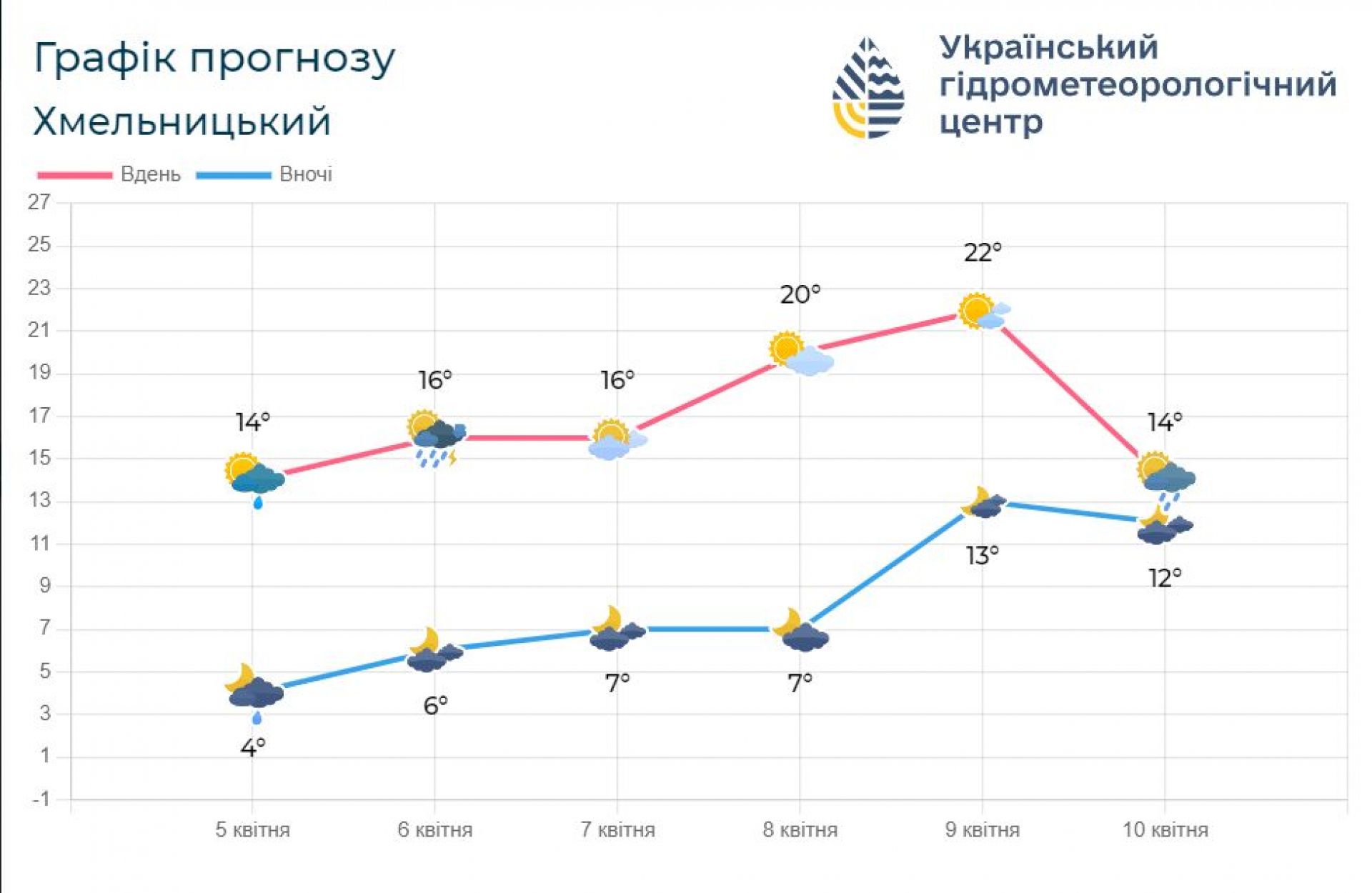 У Хмельницькому нічна температура прогнозується в межах 6-8 градусів тепла, вдень, за словами синоптиків, термометри покажуть 15-17 градусів.
