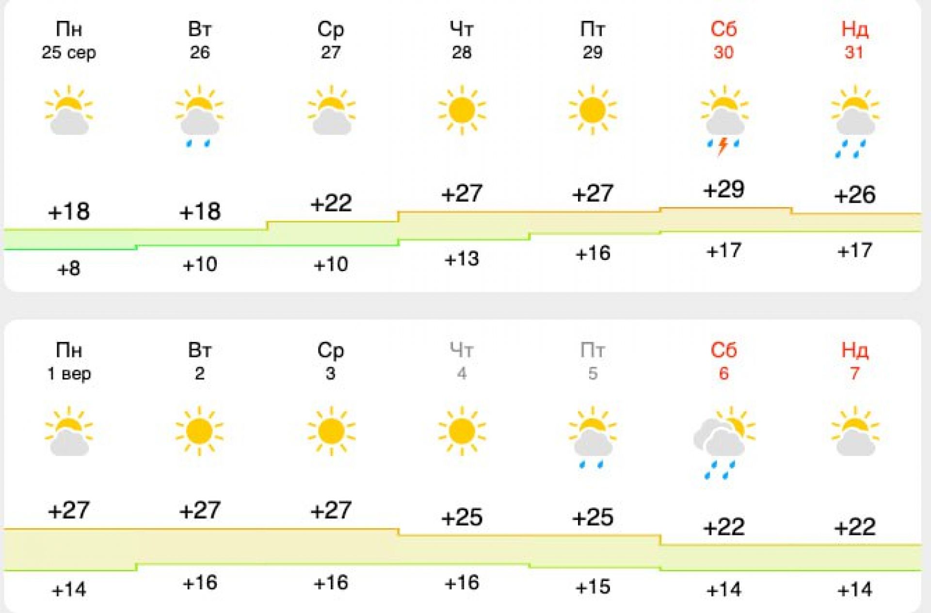 Та вже з середи погода значно потепліє. У четвер очікується сонячна й тепла погода, вдень повітря прогріється до +27 °C. Така температура триматиметься до кінця тижня. Після цього знову ймовірне похолодання, дощі та перші ознаки осені.