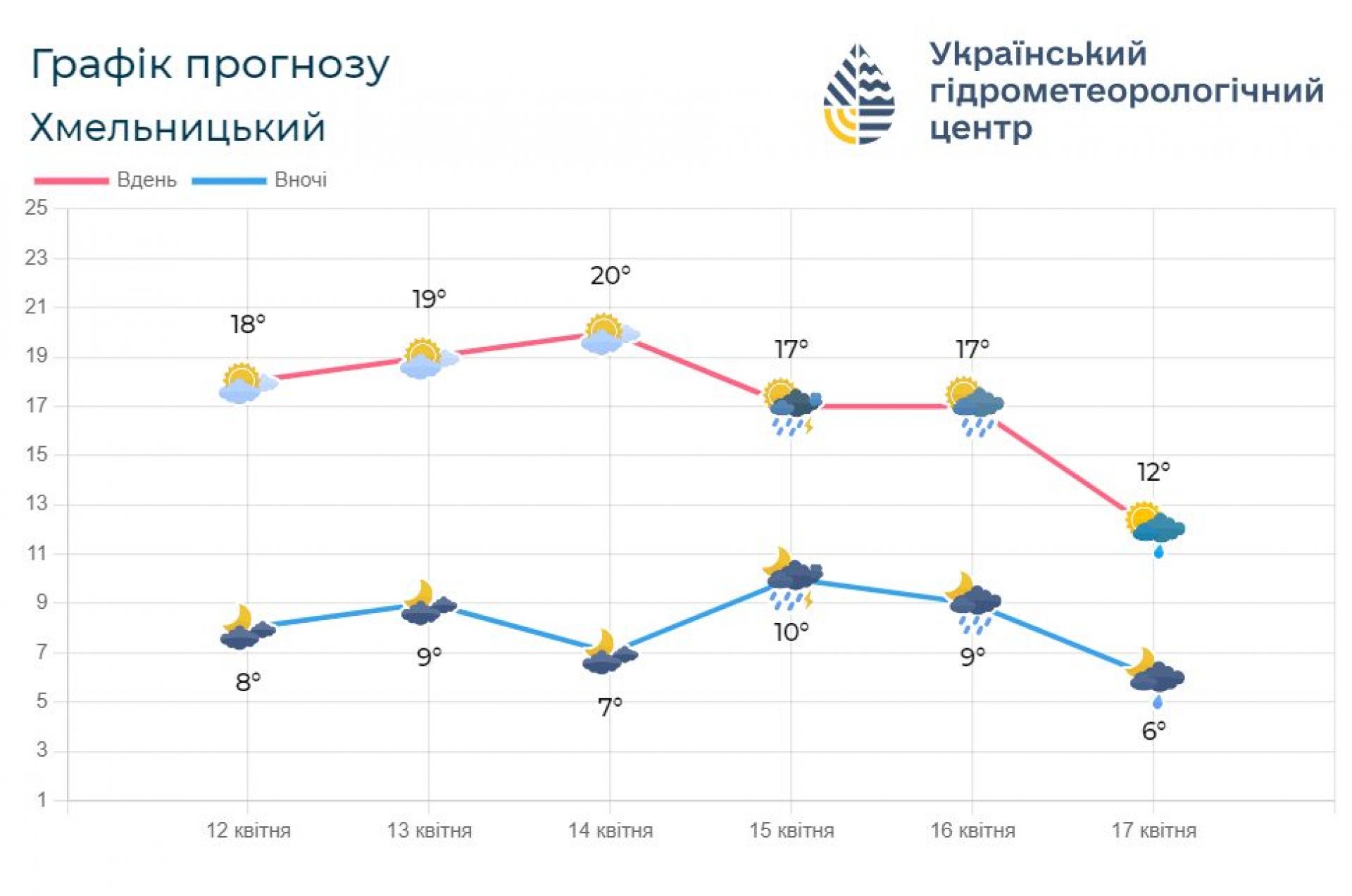 У Хмельницькому нічна температура прогнозується в межах 6-8 градусів тепла, вдень, за словами синоптиків, стовпчики термометрів піднімуться до 17-21 градуса.