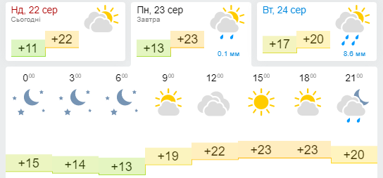 На сайті Укргідрометцентру вказано, що завтра, 23 серпня, в Хмельницькому буде від +12 до +25 градусів. Сервер вказує, що може задощити.