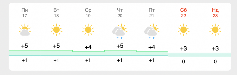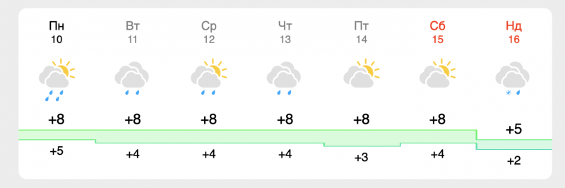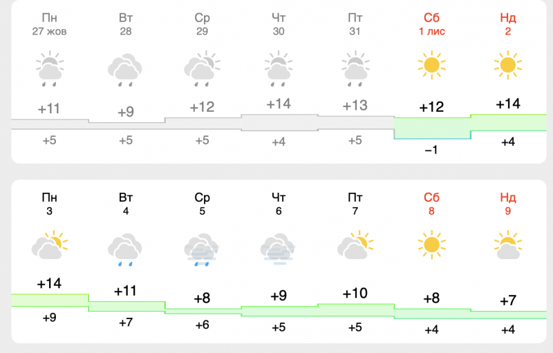 Температура почне знижуватись. Удень термометри покажуть від +9 до +11°C, а вночі — близько +4°C. Частіше буде хмарна погода та дощитиме. 16 листопада — лише +5-6°C удень і близько нуля вночі. Вже 16-го, у неділю, може випасти перший мокрий сніг.