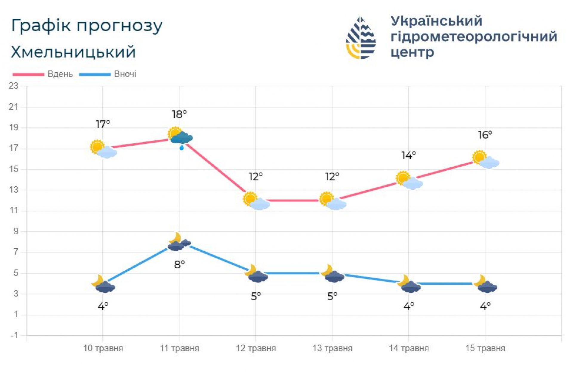 У Хмельницькому вночі прогнозується від 7 до 9 градусів з позначкою «+». Вдень буде 17-19 градусів.