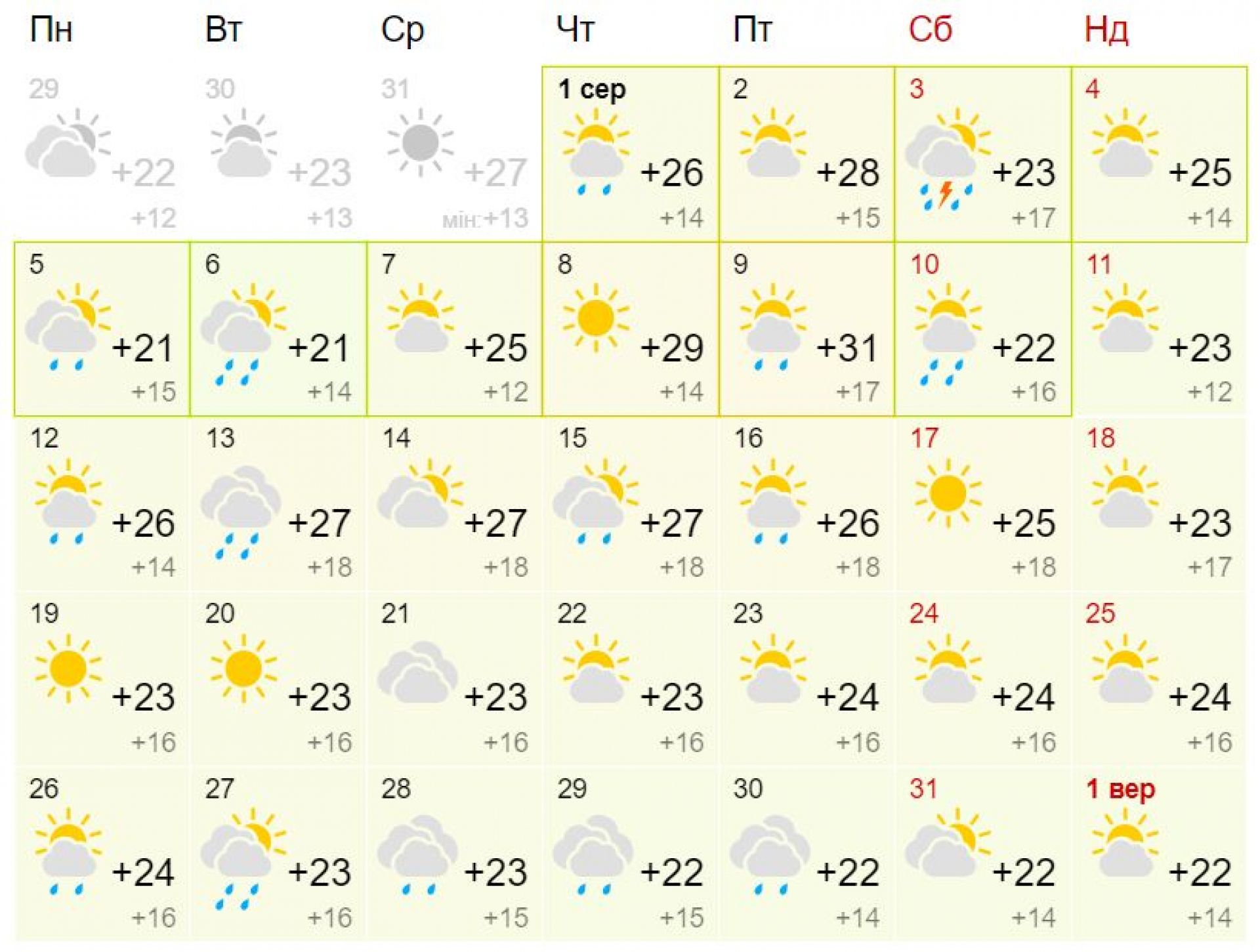 Серпень взяв початок з тепла. Та вже з 3 по 6 серпня температура повітря знизиться і коливатиметься від 21 до 25 градусів вдень і буде в межах 12-16 градусів вночі. В ці дні пройдуть дощі. У суботу, 3 серпня, дощ розпочнеться вночі і може перерости в грозу вдень.