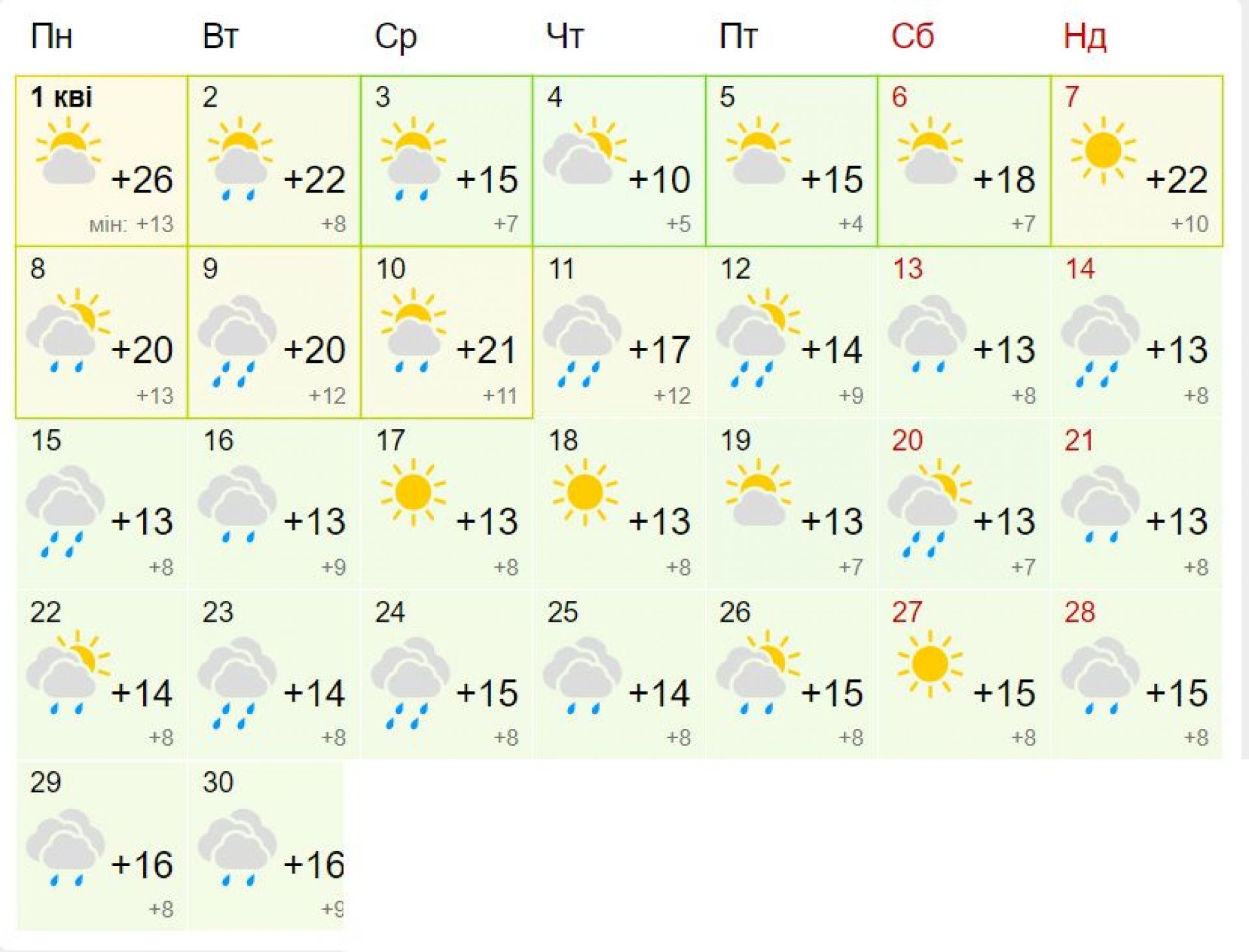 Нове пониження температури майже на 10 градусів очікується в середині місяця. А саме, з 13 по 17 квітня буде від 10 до 13 градусів. Також інтенсивно йтимуть дощі. Небо буде хмарним без прояснень.