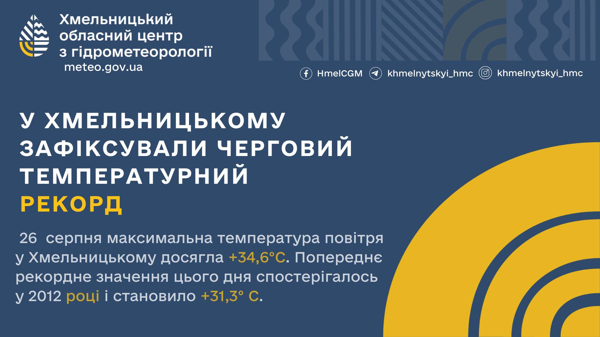 У Хмельницькому та в інших містах області 26 серпня зафіксували температурний рекорд за всю історію спостережень за погодою, яку ведуть з 1945 року. Про це повідомили в регіональному центрі з гідрометеорології.