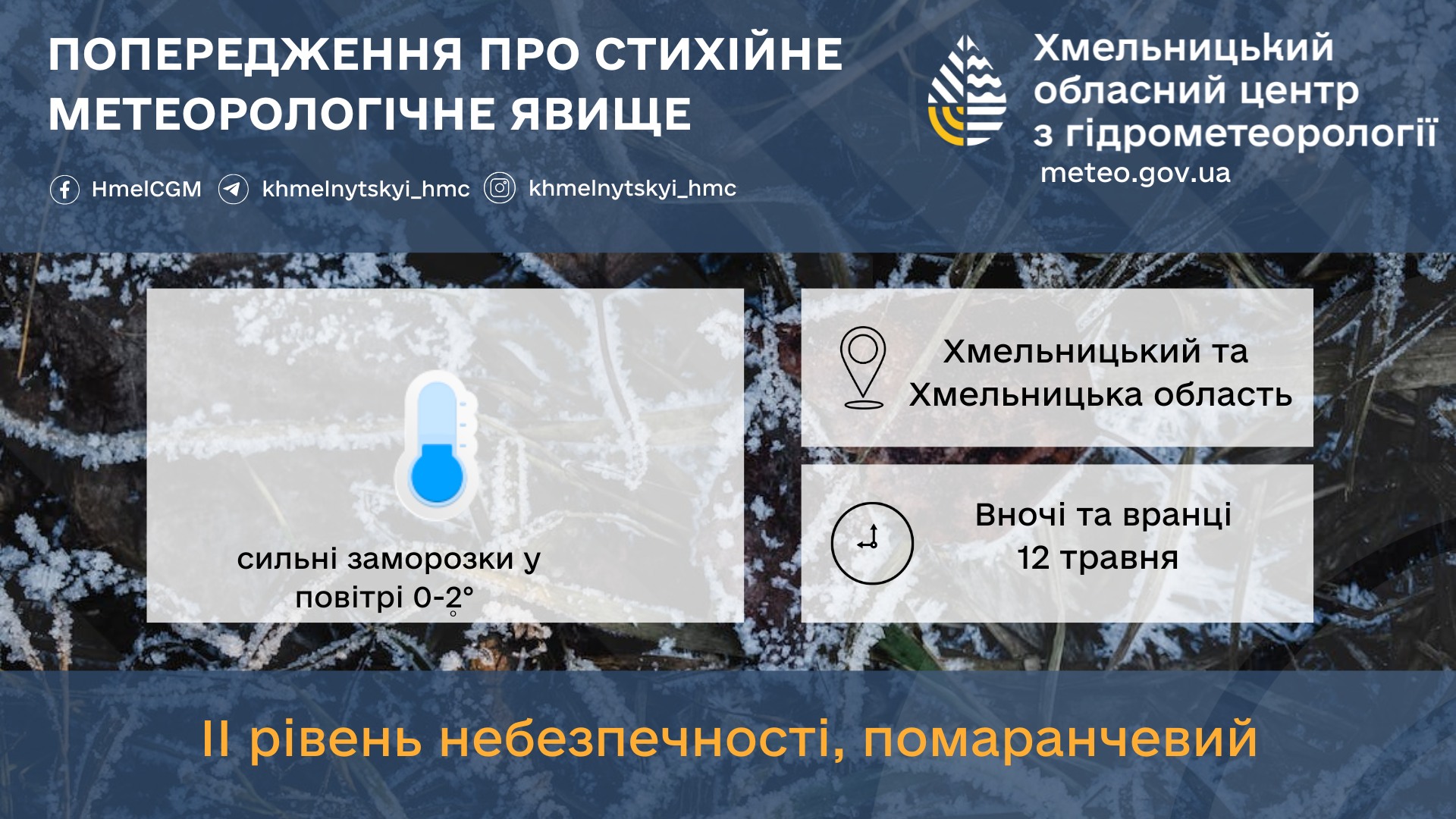По Хмельницькій області та в обласному центрі вночі та вранці 12 травня очікуються сильні заморозки у повітрі 0-2° (II рівень небезпечності, помаранчевий). Про це повідомили в Хмельницькому обласному центрі з гідрометеорології.