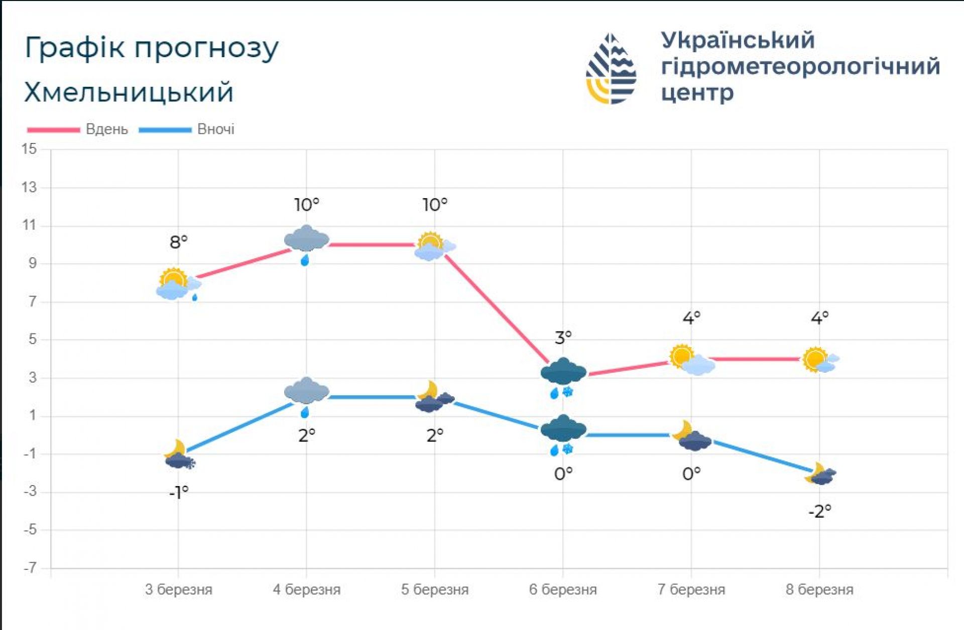 Як повідомляють в Українському гідрометеорологічному центрі, у вівторок, 5 березня, в Хмельницькому буде вночі 1-3 градуси з позначкою «плюс», вдень прогнозують 9-11 тепла. Погода буде хмарна, але з проясненнми. Опадів не очікується. Швидкість вітру, за даними – 5-10 м/с.
