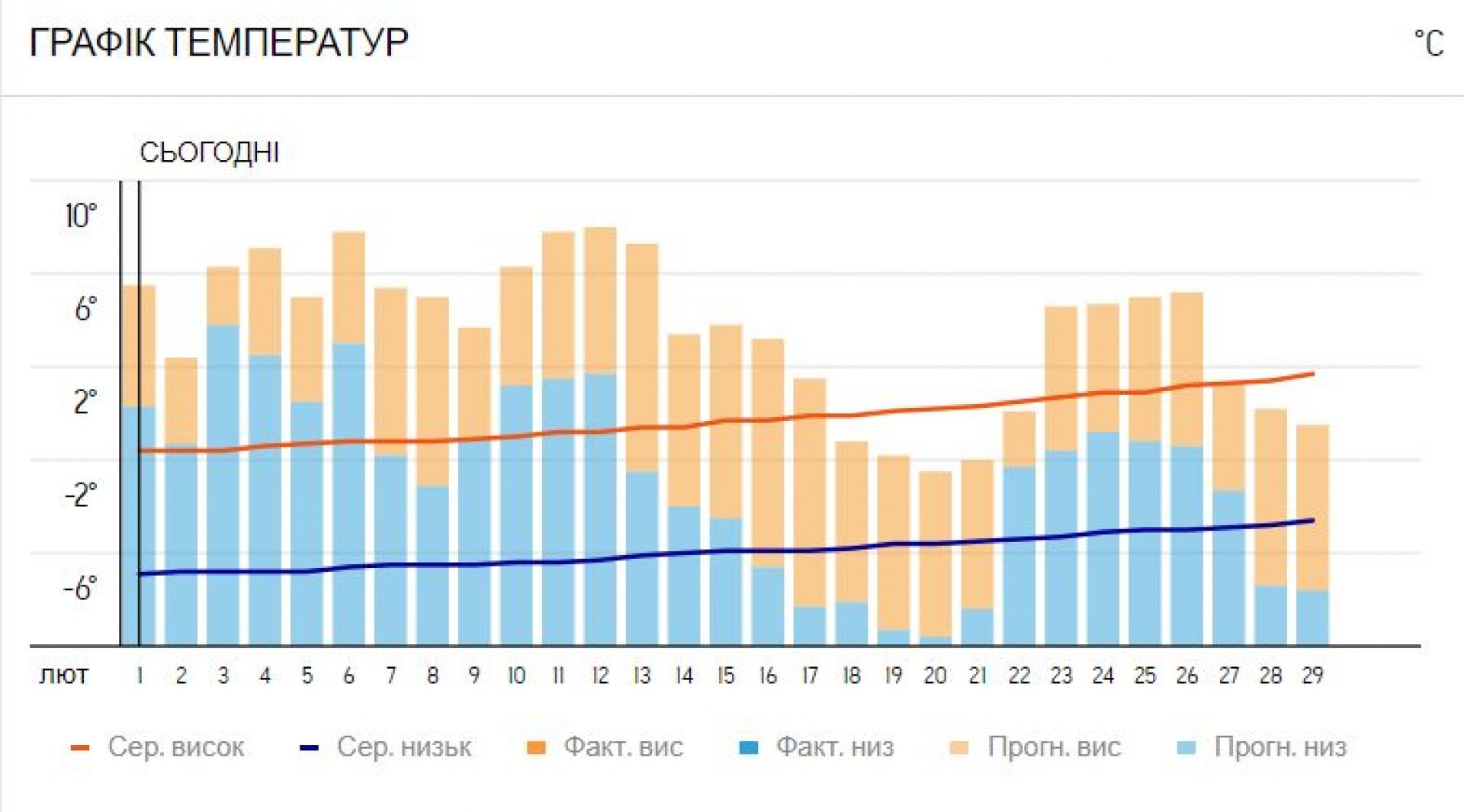 І надалі в Україні очікується теплий лютий. Середня температура буде навіть трохи вищою за норму: від 2 до 4 градусів тепла. Проте очікуються опади. Про це повідомляє Укргідрометцентр.
