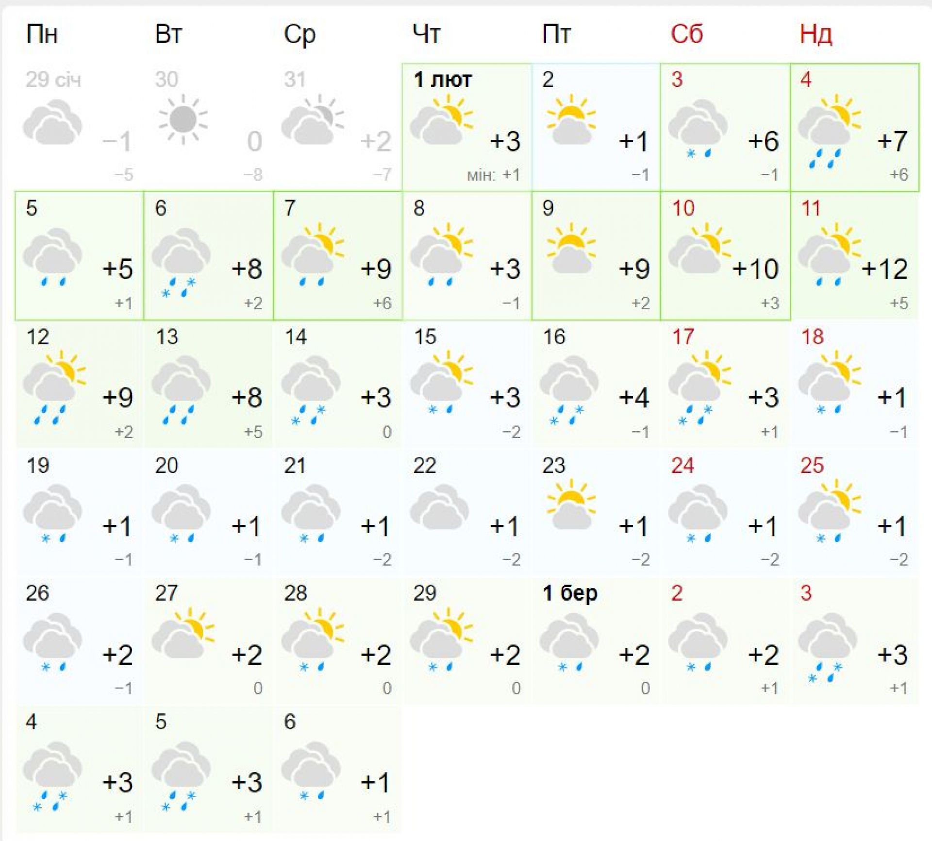 Хмльничанам на початку лютого може здатися, що після січня до них завітає березень. І справді: перші 7-12 днів лютого на Хмельниччині денна температура буде +6-12 градусів, інколи накрапатиме, пролітатиме невеликий мокрий сніг. Нічна температура коливатиметься від -1 до 3-5 градусів тепла.