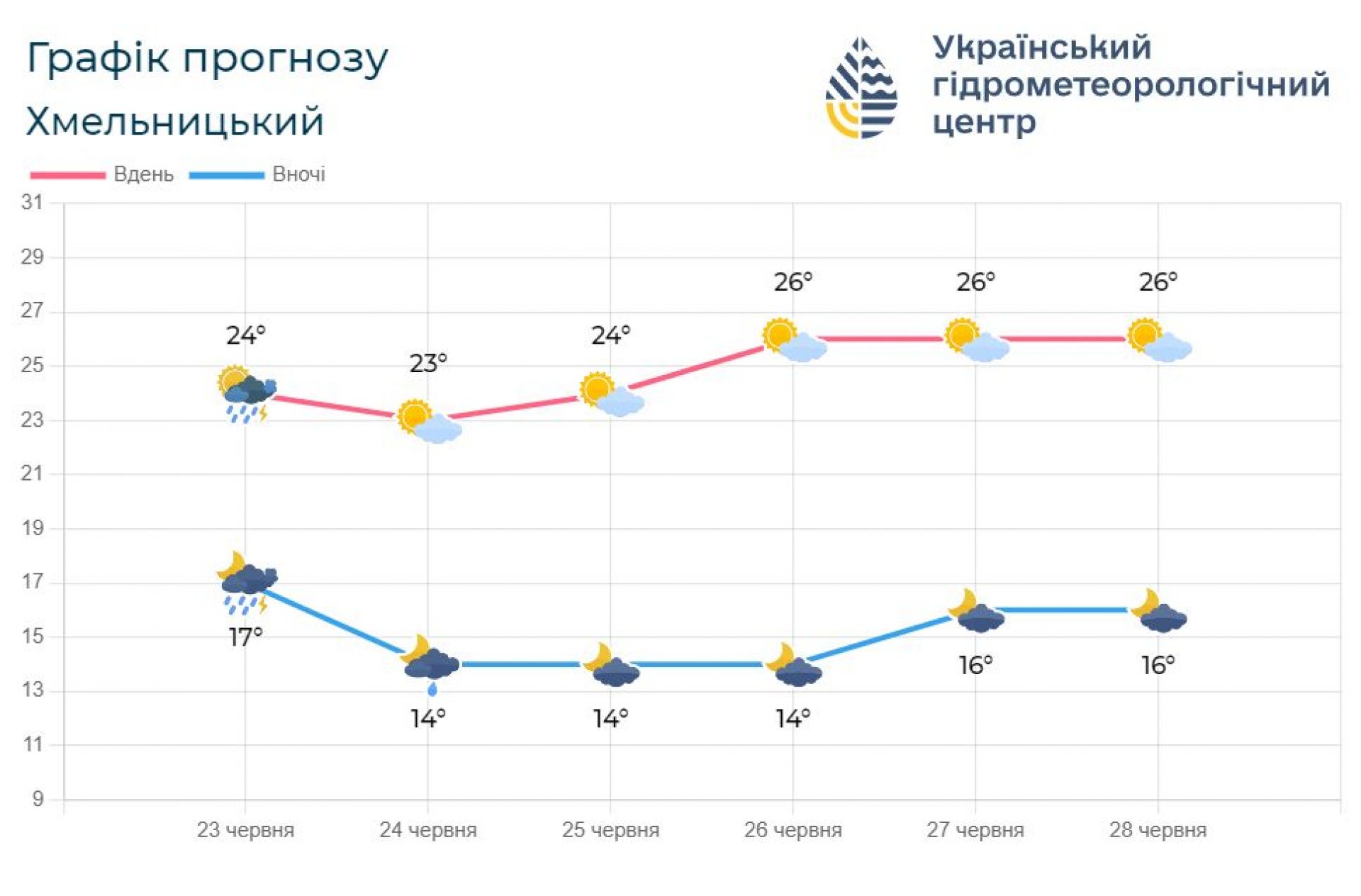 Завтра, 24 червня, у Хмельницькому небо буде хмарним з проясненням. Значних опадів не передбачається. Температура вночі 13-15 градусів, вдень 22-24 градуси вище нуля. Вітер 7-12 метрів за секунду.