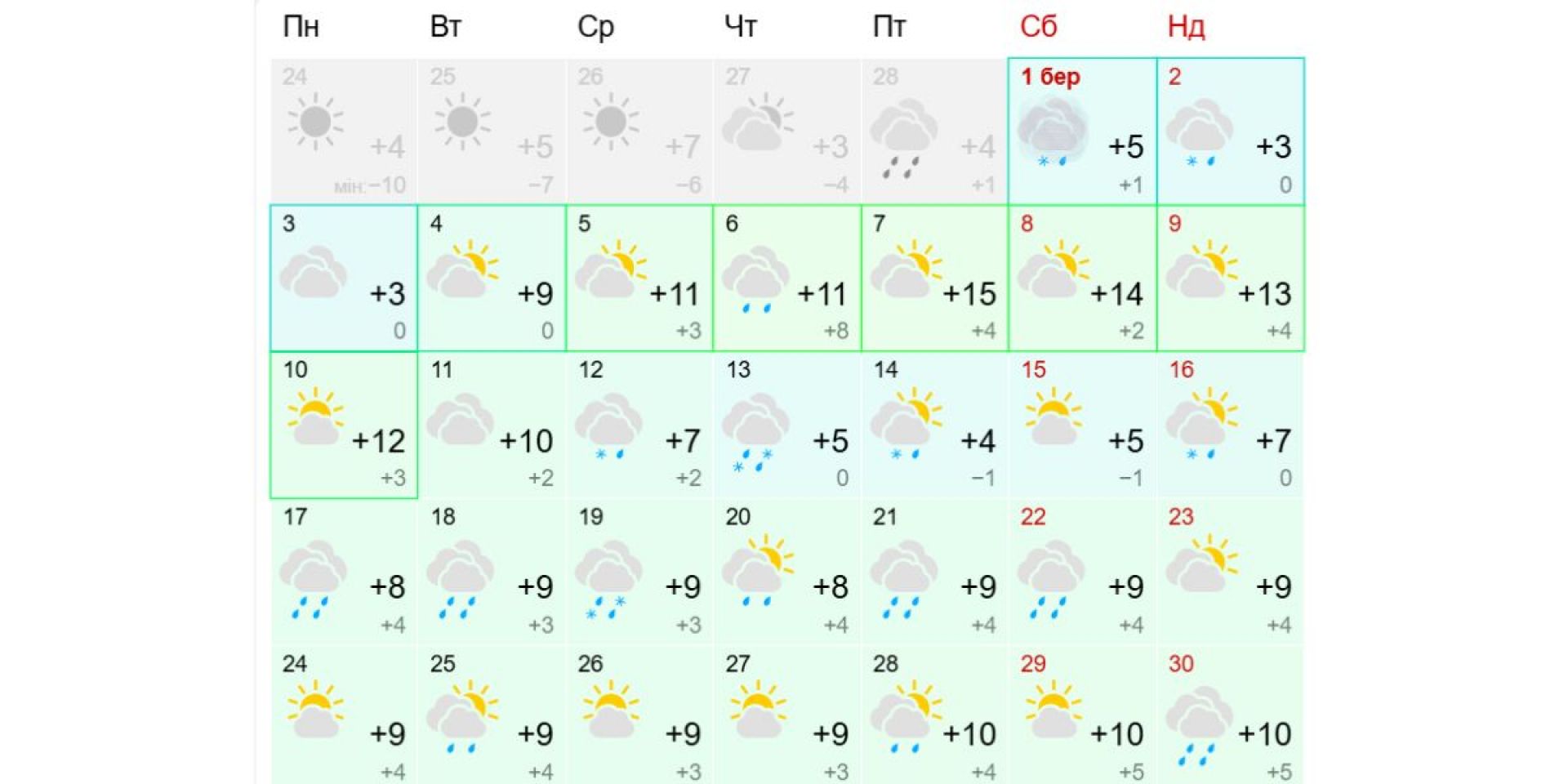 Останній тиждень березня, з 24 по 30 число, буде більш стабільним. Температура вдень буде до +9…+10°C, а вночі триматиметься в межах +3…+5°C. Сонячних днів наприкінці березня побільшає, а опадів буде менше.
