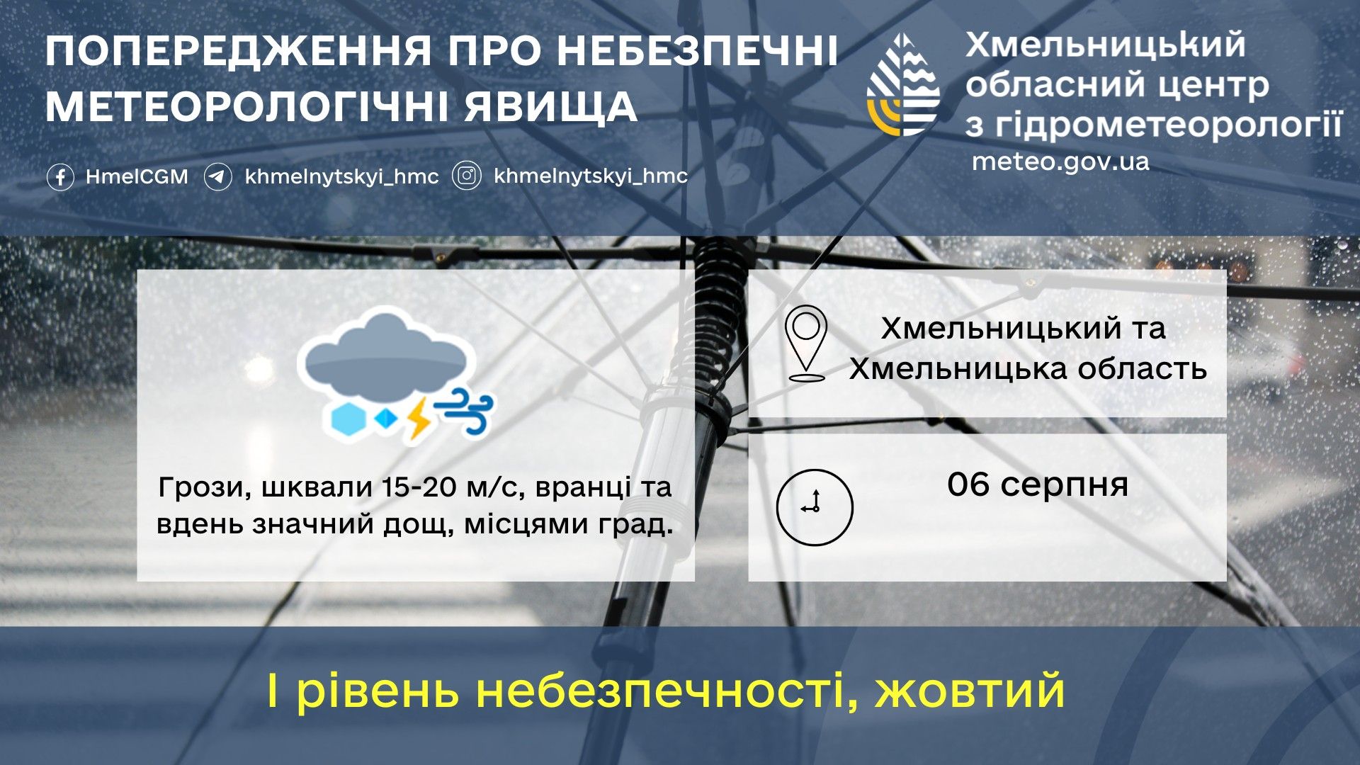 За даними Хмельницького обласного центру з гідрометеорології, 6 серпня в області передбачається хмарно з проясненням. В цю добу прогнозують опади та небезпечні метеорологічні явища. Зокрема, зранку та вдень прогнозують значний дощ та грозу. Місцями зранку три вдень може випасти град. Також синоптики попереджають про ще одне небезпечне стихійне явище: сильний вітер. Шквали очікуються до 15 – 20 метрів за секунду. Фахівці попереджають, що негода може накрити як населені пункти по області, так і сам обласний центр — місто Хмельницький. У зв’язку з цим оголошено І рівень небезпечності (жовтий).