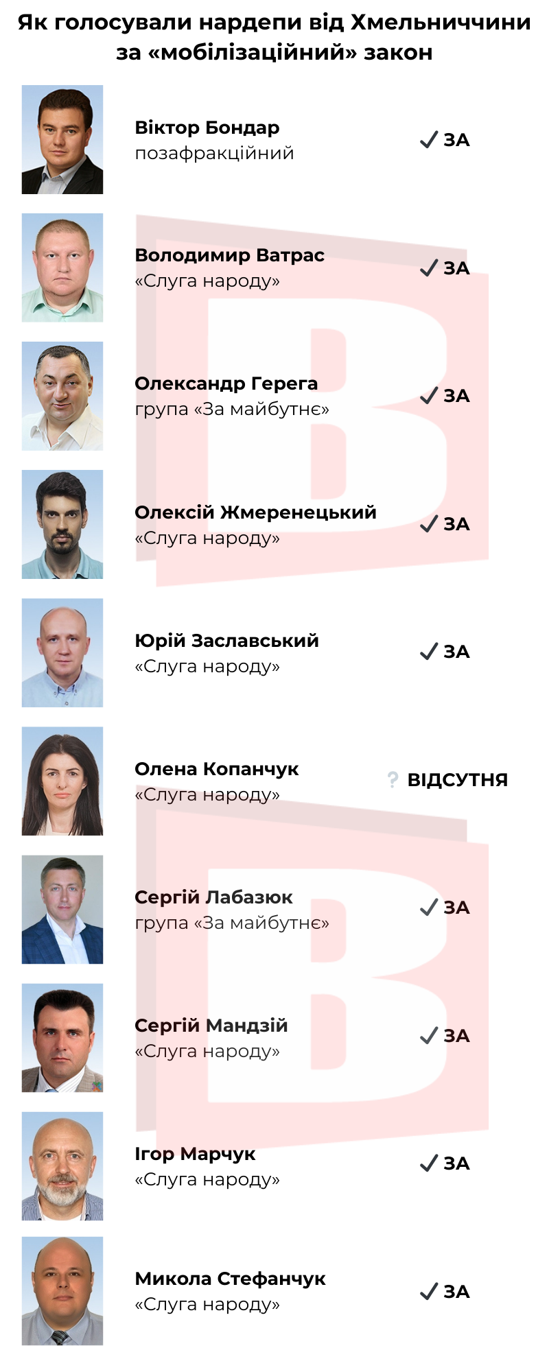 Ухвалили «мобілізаційний» закон 283 голосами, також 1 депутат голосував проти, 49 утрималися та 18 не голосували. Підтримали документ майже всі депутати від Хмельницької області, лише депутатка зі «Слуги народу» Олена Копанчук була відсутня. Список депутатів від Хмельниччини та результати їхнього голосування в інфографіці нижче.