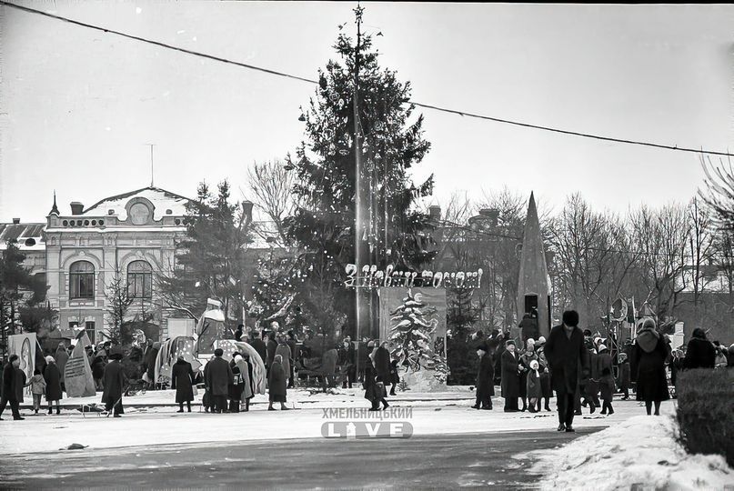 Наступним фото поділилися дописувачі сторінки "Хмельницький Live". Світлину датують 50-70 роками минулого століття. На фото видно, що новорічну ялинку встановили біля будівлі колишнього реального училища. Зараз у цьому приміщенні розташована Хмельницька міська рада.