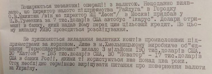 — Не припиняються вкладання валютних коштів промисловими підприємствами за кордоном. Лише в м.Хмельницькому виробниче об’єднання «Термопластавтомат» вклало 3 мільйони 190 тис.доларів США, ВО «Катіон» — 185 тис.доларів США, ВО «Новатор» — 17 тис.доларів США в банки Росії, якими ті користуються вже понад два роки, — розповів Паньков.