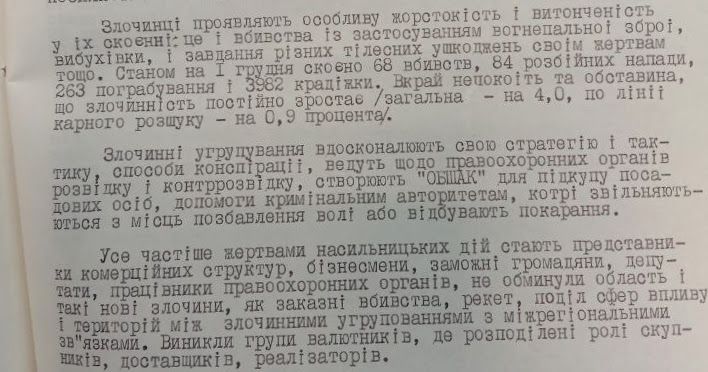 — Усе частіше жертвами насильницьких дій стають представники комерційних структур, бізнесмени, заможні громадяни, депутати, працівники правоохоронних органів, не обминули область і такі нові злочини, як заказні вбивства, рекет, поділ сфер впливу і територій між злочинними угрупованнями з міжрегіональними зв’язками. Виникли групи валютників, де розподілені ролі скупників, доставщиків, реалізаторів.