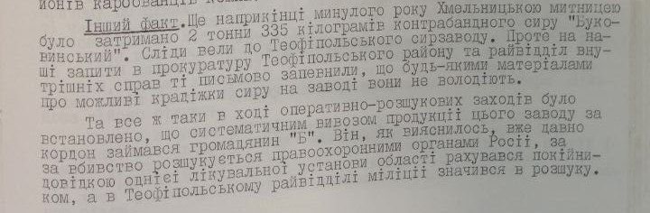 Також він розповів про цікаву історію, яка трапилася на Теофіпольському сирзаводі. Наприкінці 1993 року Хмельницька митниця затримала 2,335 тонни контрабандного сиру «Буковинський». Правоохоронці з’ясували, що він виготовлений у Теофіполі. Відтак подали запит у тамтешні міліцію та прокуратуру. Але там відповіли, що про можливі крадіжки сиру нічого не знають.