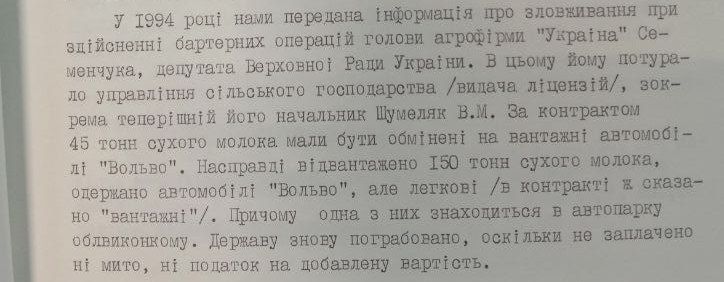 — За контрактом 45 тонн сухого молока мали бути обмінені на вантажні автомобілі «Вольво». Насправді відвантажено 150 тонн сухого молока, одержано автомобілі «Вольво», але легкові… Причому одна з них знаходиться в автопарку облвиконкому. Державу знову пограбовано, оскільки не заплачено ні мито, ні податок на добавлену вартість, — сказав Клюс.