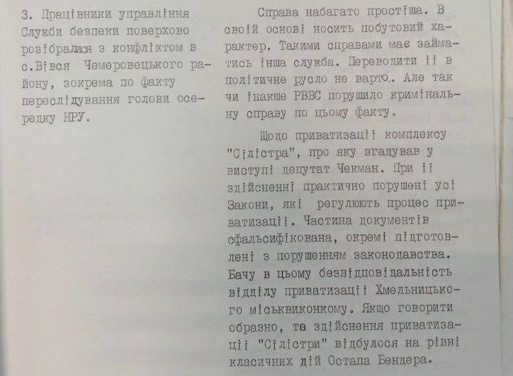 — Частина документів сфальсифікована, окремі підготовлені з порушенням законодавства. Бачу в цьому безвідповідальність відділу приватизації Хмельницького міськвиконкому. Якщо говорити образно, то здійснення приватизації «Сілістри» відбулося на рівні класичних дій Остапа Бендера.