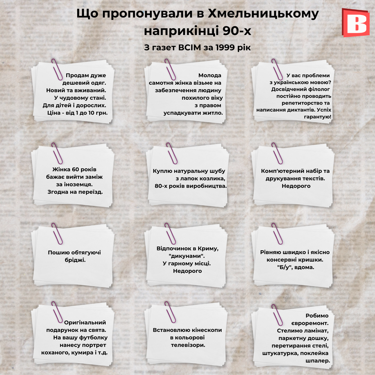 Журналістка vsim.ua оглянула номери газет за 1999 рік. Таким чином зібрала 24 оголошення, які можуть описати тодішнє життя хмельничан. Переглядайте далі, що тоді пропонували та які послуги були популярними.